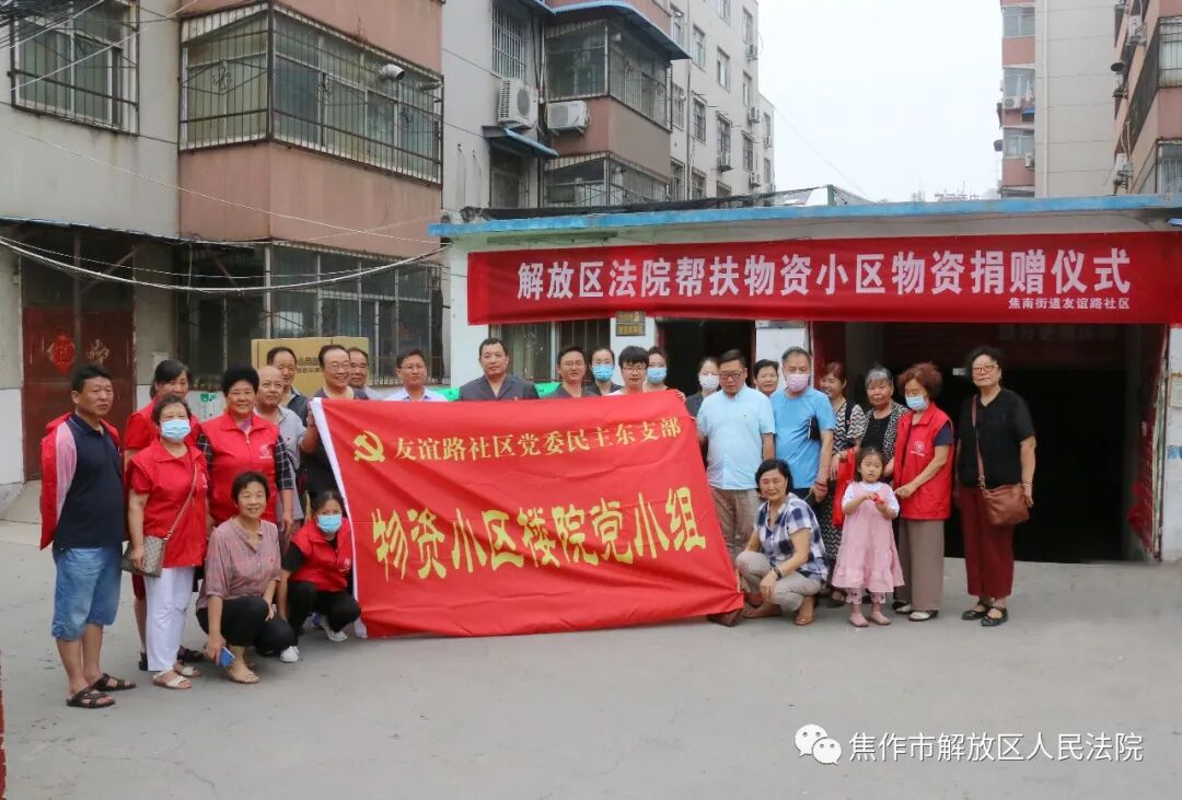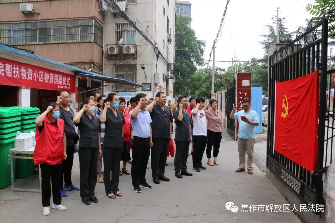 七一前夕,解放区人民法院党员干警来到焦南街道友谊路社区开展支部联建帮扶活动,向该社区捐赠了档案柜、垃圾桶、急救箱、雨架雨伞等物资,助力该社区加快完善基础设施建设。与该社区党员干部一起重温入党誓词,还就如何加强党建共建、实现支部之间互帮互助优势互补和广泛开展“弘扬劳动精神 争当出彩先锋”活动等工作进行座谈交流。